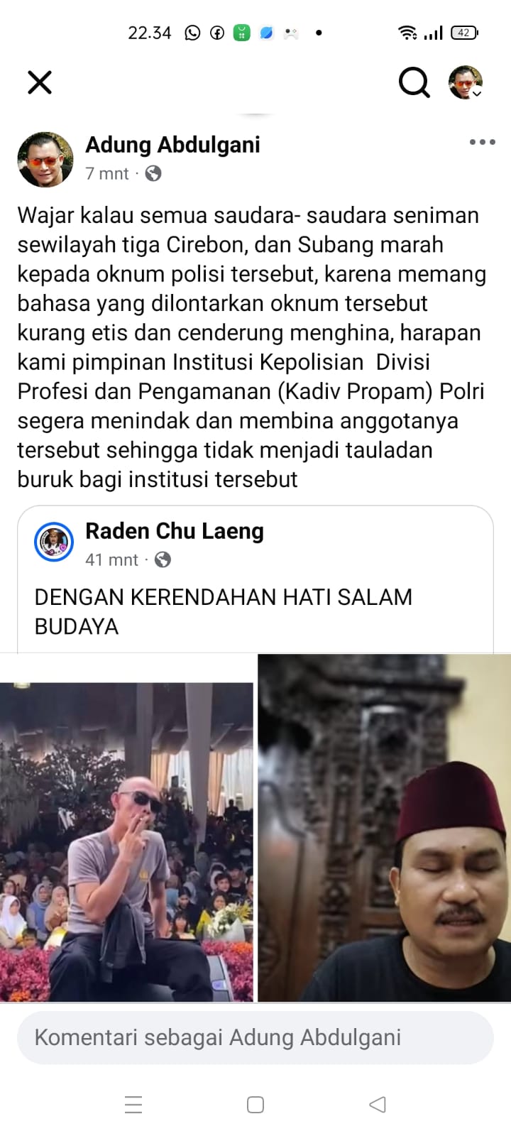 Unggahan tersebut kemudian dikomentari oleh pengguna lain bernama Raden Chu Laeng yang menyampaikan salam budaya dengan nada merendah hati. Meskipun demikian, fokus utama dari unggahan awal adalah kekecewaan dan tuntutan tindakan terhadap oknum polisi yang diduga melakukan penghinaan terhadap para seniman.