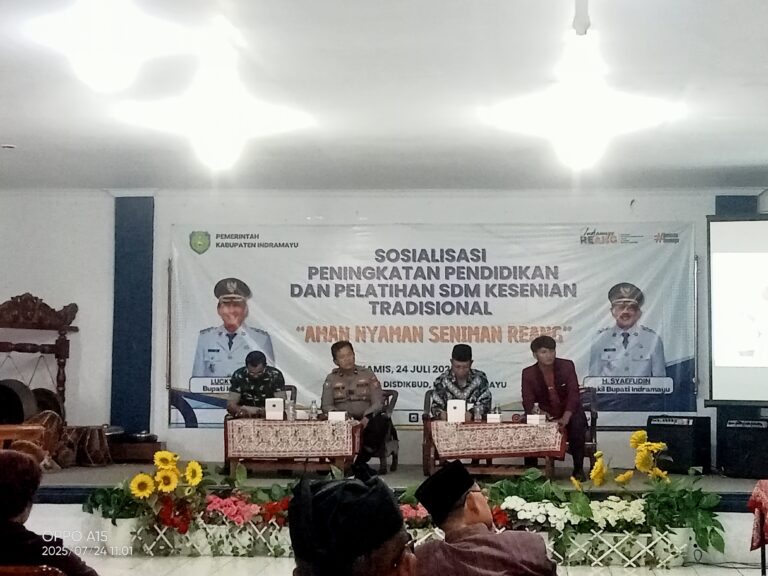 Indramayu, suarapantura.id – Sebanyak 200 perwakilan sanggar seni dari seluruh penjuru Kabupaten Indramayu antusias mengikuti sosialisasi peningkatan pendidikan dan pelatihan Sumber Daya Manusia (SDM) kesenian tradisional. Acara yang mengusung tema “Aman Nyaman Seniman Reang” ini digelar pada Kamis, 24 Juli 2025, di Aula Dinas Pendidikan dan Kebudayaan (Disdikbud) Indramayu, Jalan MT Haryono.
